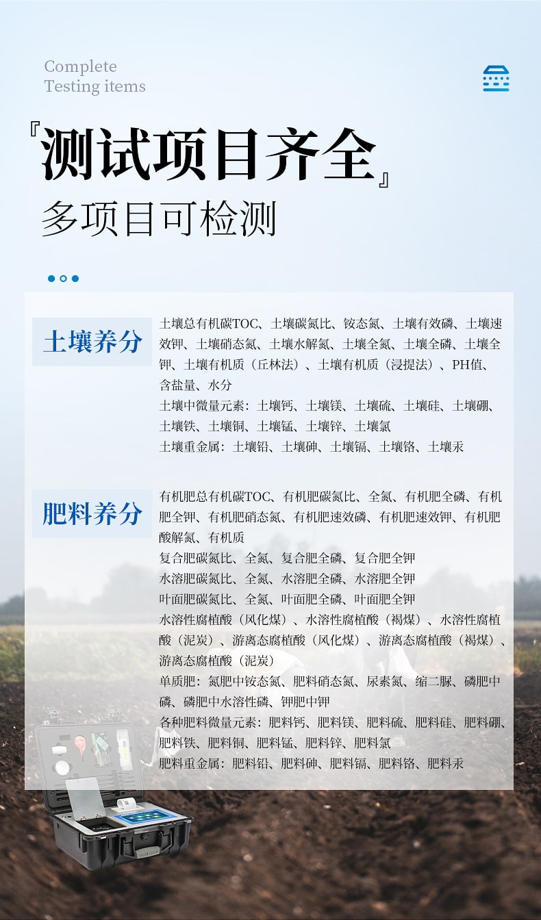 1、土壤養分:●土壤總有機碳TOC、土壤碳氮比、銨態氮、土壤有效磷、土壤速效鉀、土壤硝態氮、土壤水解氮、土壤全氮、土壤全磷、土壤全鉀、土壤有機質(丘林法)、土壤有機質(浸提法)、PH值、含鹽量、水分。●土壤中微量元素:土壤鈣、土壤鎂、土壤硫、土壤硅、土壤硼、土壤鐵、土壤銅、土壤錳、土壤鋅、土壤氯;●土壤重金屬:土壤鉛、土壤砷、土壤鎘、土壤鉻、土壤汞。