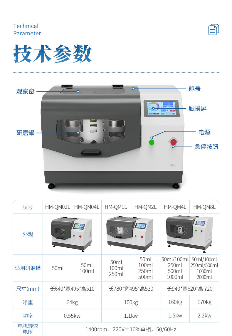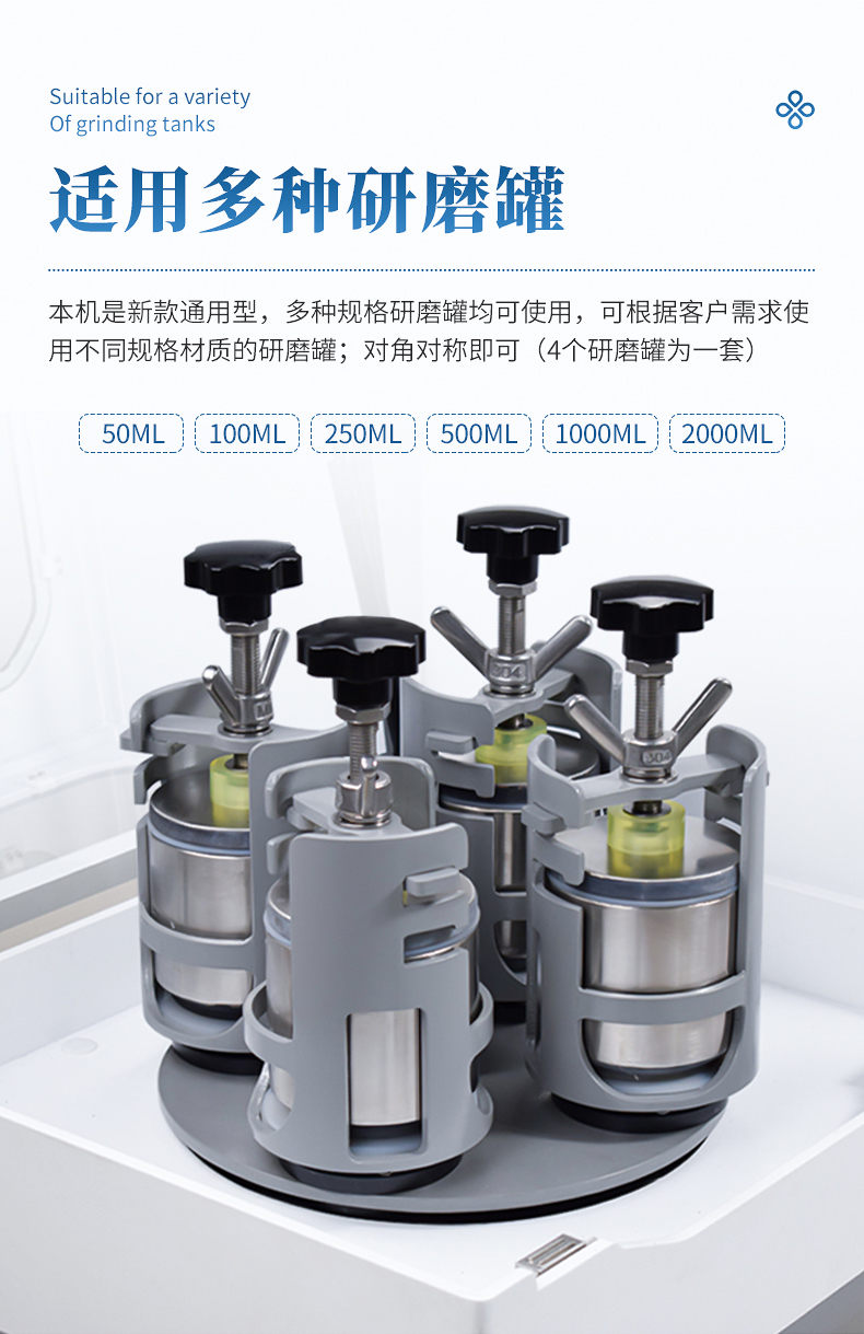 1.適用研磨罐:本機是新款通用型,100ml、250ml、500ml規格研磨罐均可使用,可根據客戶需求使用不同規格的研磨罐;對角對稱即可(4個研磨罐為一套)。